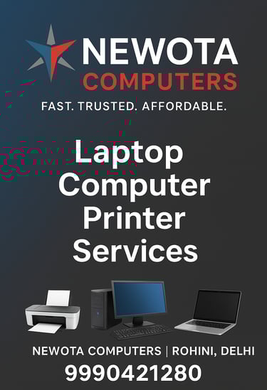 FAST. TRUSTED. AFFORDABLE.—That's the Newota Computers promise! 💻 Stop letting tech issues slow down your day. We provide best-in-class service for all your essential IT needs right here in Rohini, Delhi. Our Priority Services: Laptop & Computer Repair: From software crashes and performance boosts (SSD/RAM Upgrades) to complex hardware fixes and virus removal, we get your PC working flawlessly. Printer Services: Sales, setup, repair, and maintenance for all models (Laser, Inkjet, All-in-One). We keep your office running smoothly. Why Choose Newota? We combine expert technical skill with unparalleled convenience. Call today for quick, reliable, and affordable IT solutions! 📲 Call Now: 9990421280 #NewotaComputers #LaptopRepair #PrinterService #Computer