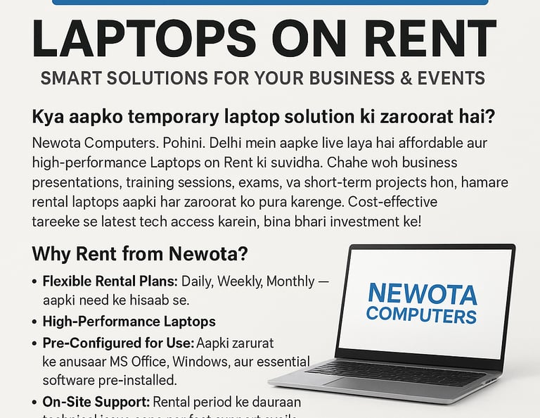 Your IT Solutions Partner Introduction: The Newota Promise (Targeting Urgency and Trust) In today’s high-speed digital economy, a malfunctioning laptop, a slow computer, or a faulty printer isn't just an inconvenience—it's a massive drag on productivity and profitability. At Newota Computers, we understand the critical reliance businesses and individuals in Rohini, Delhi, and North Delhi have on seamless technology. Our posters and social media communication are designed to cut through the noise, delivering a clear message: We are your comprehensive, reliable, and best-in-class IT solutions partner. We don't just fix devices; we guarantee performance and future-proof your workflow. Section 1: Core Repair Services — Fast, Reliable, Expert (Focusing on the Red Poster) The red repair poster (28oct.jpg) vividly highlights our commitment to being FAST. RELIABLE. EXPERT. This section details why Newota Computers is the superior choice for troubleshooting and restoring critical devices: Comprehensive Device Repair: We cover both Laptop Repair and Desktop Repair. For laptops, this includes fixing common issues like Screen Replacement, Keyboard Fixes, Battery Issues, and Overheating Solutions. For desktops, we handle Hardware Upgrades, OS Installation, Virus Removal, and critical Data Recovery. This ensures all bases are covered for immediate user needs. Component Level Expertise (The USP): We don't just replace parts; we offer Component Level Expertise. This means highly technical services like Motherboard Repair and Chip-Level Servicing. This skill set sets us apart from standard repair shops, allowing for more cost-effective solutions and repairing high-value components rather than just replacing them entirely. Performance Enhancement: We focus on making systems faster than before. Our services include Performance Boost upgrades like SSD Upgrades (for lightning-fast boot times), RAM Expansion, and Software Optimization to eliminate lag and maximize efficiency. Security & Maintenance: Recognizing the constant threat of cyber issues, we offer Virus & Malware Removal, including Comprehensive System Cleanup & Protection, ensuring both data integrity and device longevity. Section 2: Expanding the Portfolio — Printers, Sales & Office Setup Our services extend well beyond basic break/fix to encompass the full IT ecosystem of a home or small office: Printer & Peripheral Solutions: As seen in our communication (8️⃣ Printer & Peripherals.jpg), we are a One Stop for Office Devices. We provide Sales, Setup, and Maintenance for all types of printers, ensuring your essential peripheral devices are always functioning correctly. Genuine Software Licensing: We ensure compliance and security by providing Genuine Software Licensing (GENUINE SOFTWARE LICENCE.jpg) for critical tools like MS Office, Windows, and Antivirus solutions. This removes the risk associated with pirated software and provides stability. Laptop & Desktop Sales: Newota is the source for acquiring reliable devices (LAPTOP AND DESKTOP SALE.jpg). We provide Laptops & Desktops bundled with Genuine Windows 11 | Office 365 | Office 2024, offering a clean, authorized start for any user or business in Rohini | North Delhi. Office Setup & Upgrades: We specialize in helping businesses and institutions establish robust IT environments. Our "UPGRADE YOUR OFFICE SETUP" message (gmb 27oct.jpg) highlights our role in designing, installing, and configuring a complete technical infrastructure, ensuring a smooth, scalable, and powerful start. Section 3: Modern Solutions — Renting, Automation & Security Newota Computers addresses modern business needs through flexible and advanced services: Laptops On Rent (Smart Solutions): Our rental service (insta post 1-11.jpg) provides Smart Solutions for Your Business & Events. This is a cost-effective, temporary IT solution, offering Flexible Rental Plans (Daily, Weekly, Monthly) and High-Performance Laptops that are Pre-Configured for Use with essential software. This service is ideal for training, exams, temporary staff, and events. Digital Automation & Workflow: We help clients overcome digital stress (auto reply.jpg) by implementing Digital Automation Solutions. The visual of a relaxed user (auto reply with tech.jpg) indicates we set up systems to manage queries across platforms like WhatsApp, Instagram, and LinkedIn, freeing up clients' time. Security Systems: Our offerings include CCTV INSTALLATION AND SECURITY (CCTV INSTALLATION AND SECURITY.jpg). This critical service provides 24/7 Monitoring | Remote Access and ensures the physical security of our clients’ premises. IT Support & Maintenance: We function as a true IT partner with IT Support & Maintenance (9️⃣ IT Support & Maintenance (General).jpg), offering Onsite & Remote Assistance to manage all systems effectively.