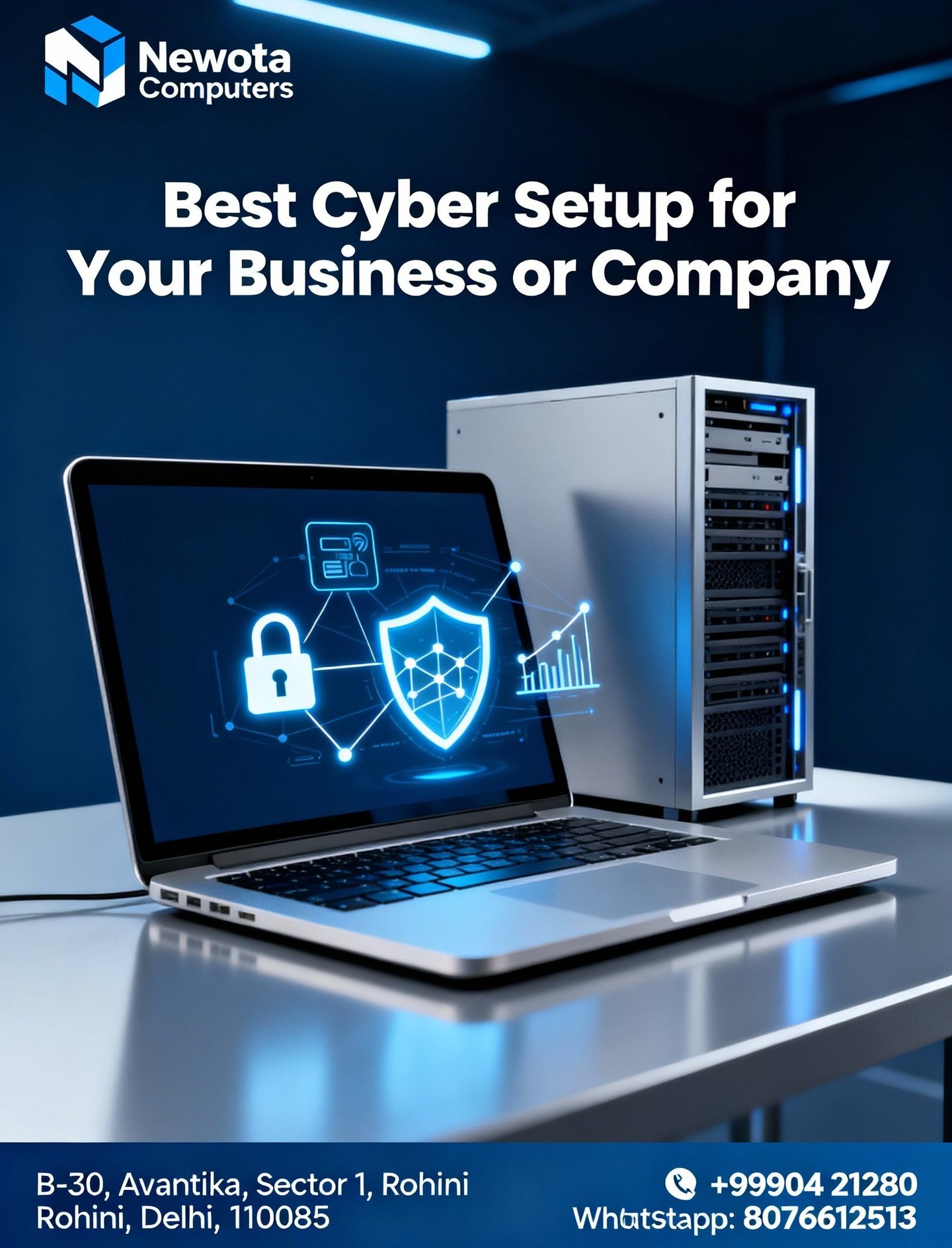 Newota Computers — Professional Cyber Setup Services in Delhi, Rohini In today’s digital era, every business needs a strong and secure IT foundation. At Newota Computers, we specialize in providing comprehensive Cyber Setup Services that empower your business with advanced technology, data protection, and reliable infrastructure. Based in Rohini, Delhi, we have become a trusted name for cyber setup, networking, and IT infrastructure solutions across North Delhi and nearby areas. Our Cyber Setup Service is designed for both small and large businesses that want a secure, efficient, and scalable digital environment. We start by understanding your organization’s requirements — whether it’s a startup, corporate office, retail business, or an industrial setup — and then build a customized cyber infrastructure that fits your goals. From network cabling, server setup, and firewall installation to data security systems, CCTV integration, and remote management tools, we handle every technical detail with precision and professionalism. At Newota Computers, we believe that cyber setup isn’t just about installing devices — it’s about creating a digital ecosystem that runs your business smoothly and securely. Our expert technicians use the latest tools and technologies to ensure your office systems are connected, monitored, and protected 24/7. Whether you need a LAN/WAN setup, secure server configuration, or network troubleshooting, our experienced team delivers reliable, high-speed, and future-ready solutions. Security is at the heart of our service. We integrate cybersecurity layers, antivirus protection, and data backup systems to ensure your critical business information is always safe from threats. Our AI-enhanced monitoring tools help detect unusual network activity early, keeping your systems safe and optimized. Alongside security, we also focus on performance optimization — reducing system lag, improving internet speed, and ensuring every connected device works efficiently. With hundreds of satisfied clients in Rohini, Pitampura, Mangolpuri, Budh Vihar, and North Delhi, Newota Computers continues to set new benchmarks in IT infrastructure and cyber setup. Our aim is to help businesses operate smarter, faster, and safer in a rapidly evolving digital world. From initial consultation to final deployment and post-installation support, we ensure a hassle-free and transparent process. Choose Newota Computers for your next Cyber Setup Project and experience the perfect balance of technology, security, and support. 📍 Visit us at: B-30, Avantika, Sector 1, Rohini, Delhi, 110085 📞 Call: +91 99904 21280 | 💬 WhatsApp: 8076612513 🌐 Your Trusted Partner in Smart & Secure IT Solutions